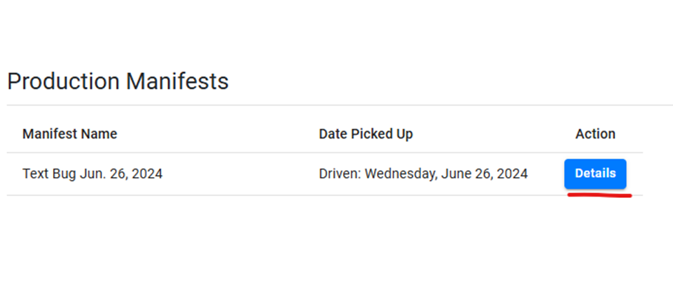 2. This will then bring you to any open production manifests you have. It will detail the route name and date. When you are ready to start filling out the information, please press, “Details”.