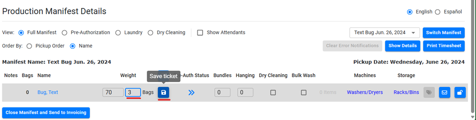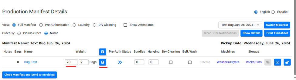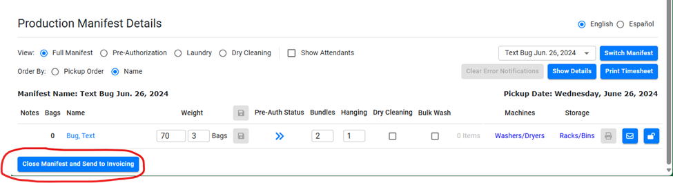 10. When that is done, you can head back to “Full Manifest” once everything is filled out and press, “Close Manifest and Send to Invoicing”.