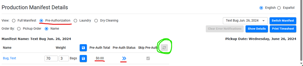 b. Next, you will press the button I’ve circled in green. In your production manifest, that button will not be greyed out and will appear in blue and be clickable. This will initiate the process to place the pre-authorization hold on customer’s cards. The pre-authorization hold tends to be about $10 more than the actual invoice itself. It may take a minute or so to process the pre-authorizations.
