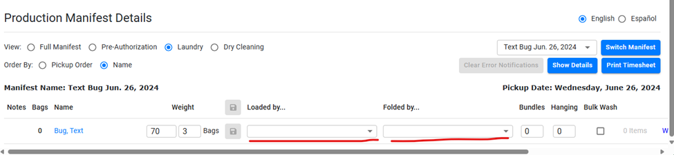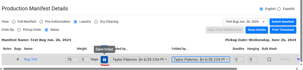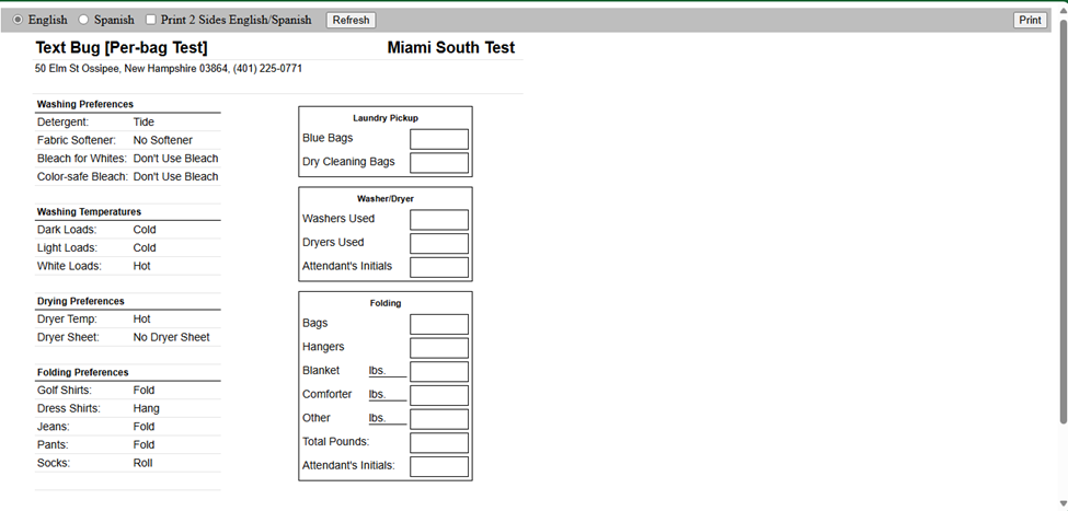 This shows the customers’ laundry preferences. You can print this page out in English, Spanish or a double-sided page that has English on one side and Spanish on the other side. This helps keep track of who worked on the order and ensures whoever is working on it is following the preferences on the account set by the customer.
