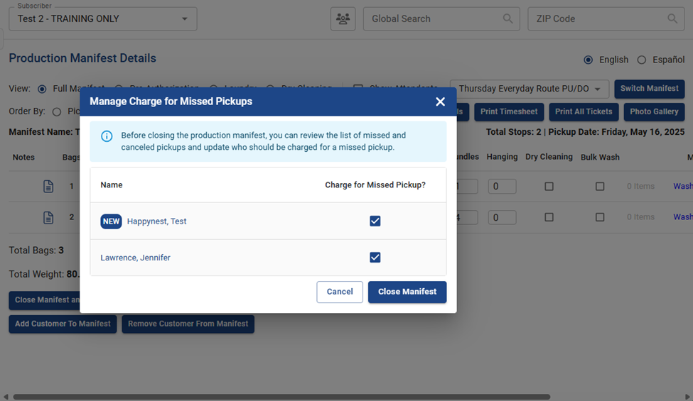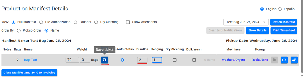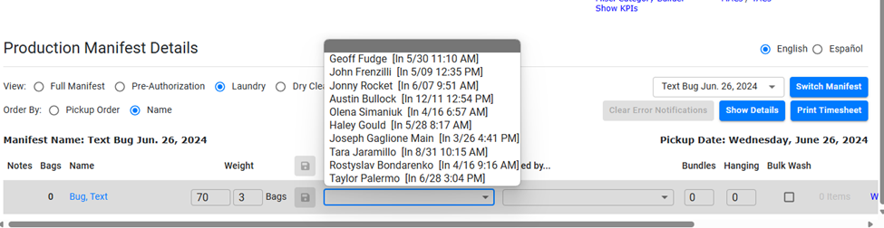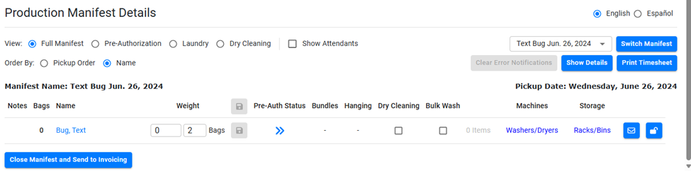- When your driver closes out the route for the day, all customers who were picked up will end up on a production manifest for the day. This will be how you bill the customers for their laundry. Please log-in and clock-in to your role for the day (Admin, Attendant or Driver). Anyone can fill out the production manifest if the admin approves of it. Once you are logged in and clocked in – please press, “Manifests” and then, “Production Manifests”