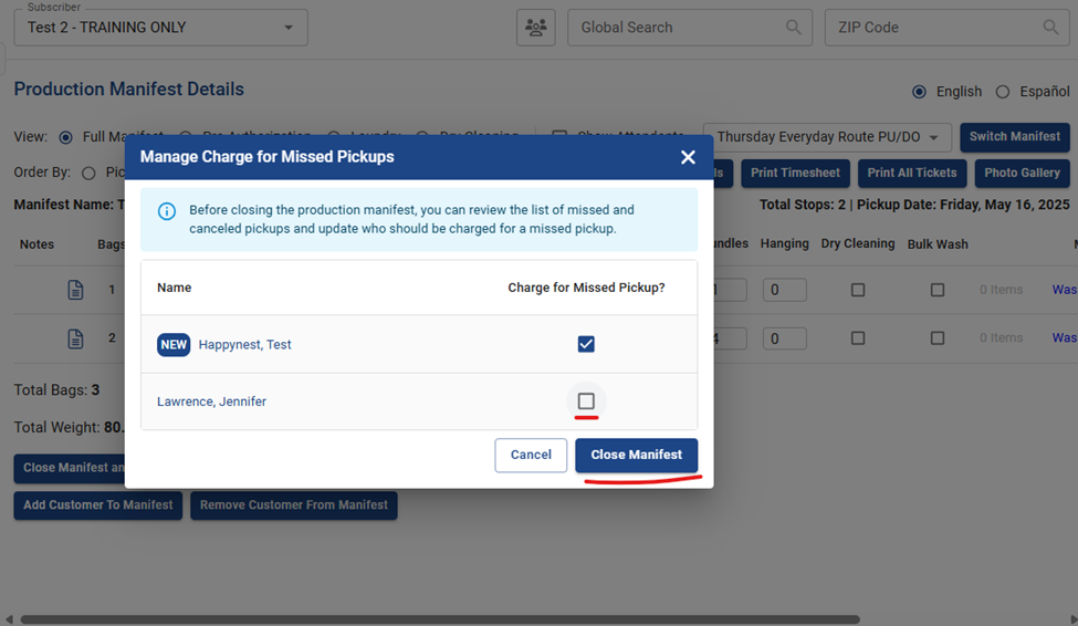 If you don’t want to charge the customer the fee, simply unclick the checkbox, then press “close manifest”.