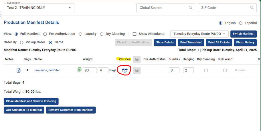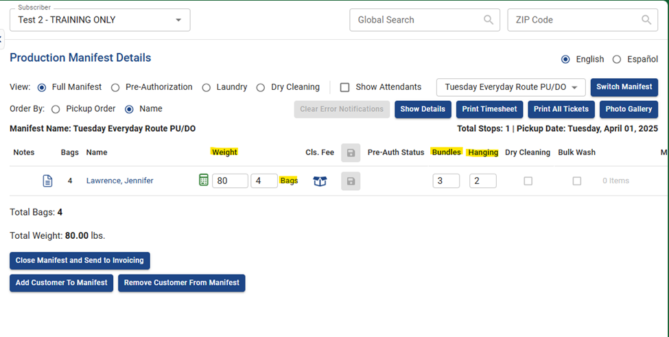 - When you are in your production manifest you will fill out your weight, bags, bundles and hanging as normal.